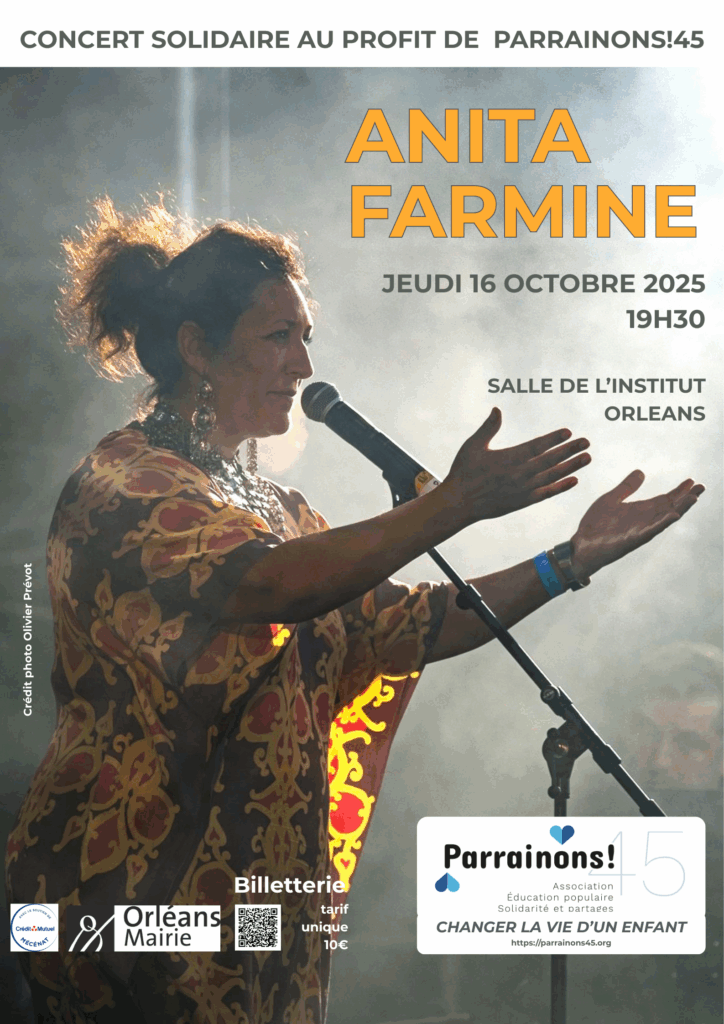 N’hésitez pas à venir écouter, le 16 octobre 2025, l’artiste franco-iranienne Anita Farmine. Elle se produira à 19h30 – salle de l’Institut à Orléans – dans un concert exceptionnel et solidaire au profit de l’association Parrainons 45. Objectif : favoriser le parrainage d’enfants accompagnés par l’Aide sociale à l’enfance.